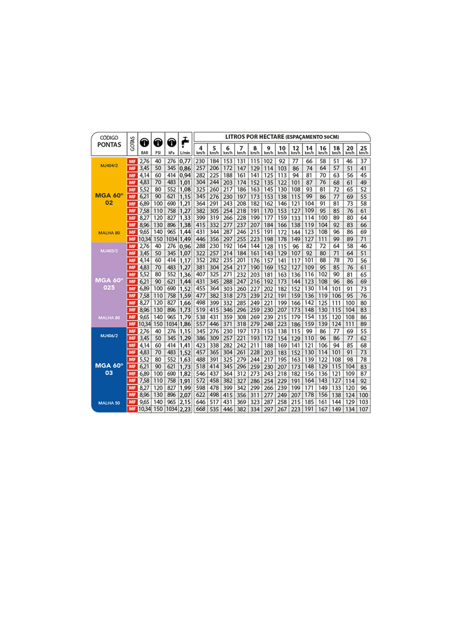- Em pulverizadores de barras, recomenda-se a série MGA 60° para espaçamentos entre porta-bicos de 35 cm;
